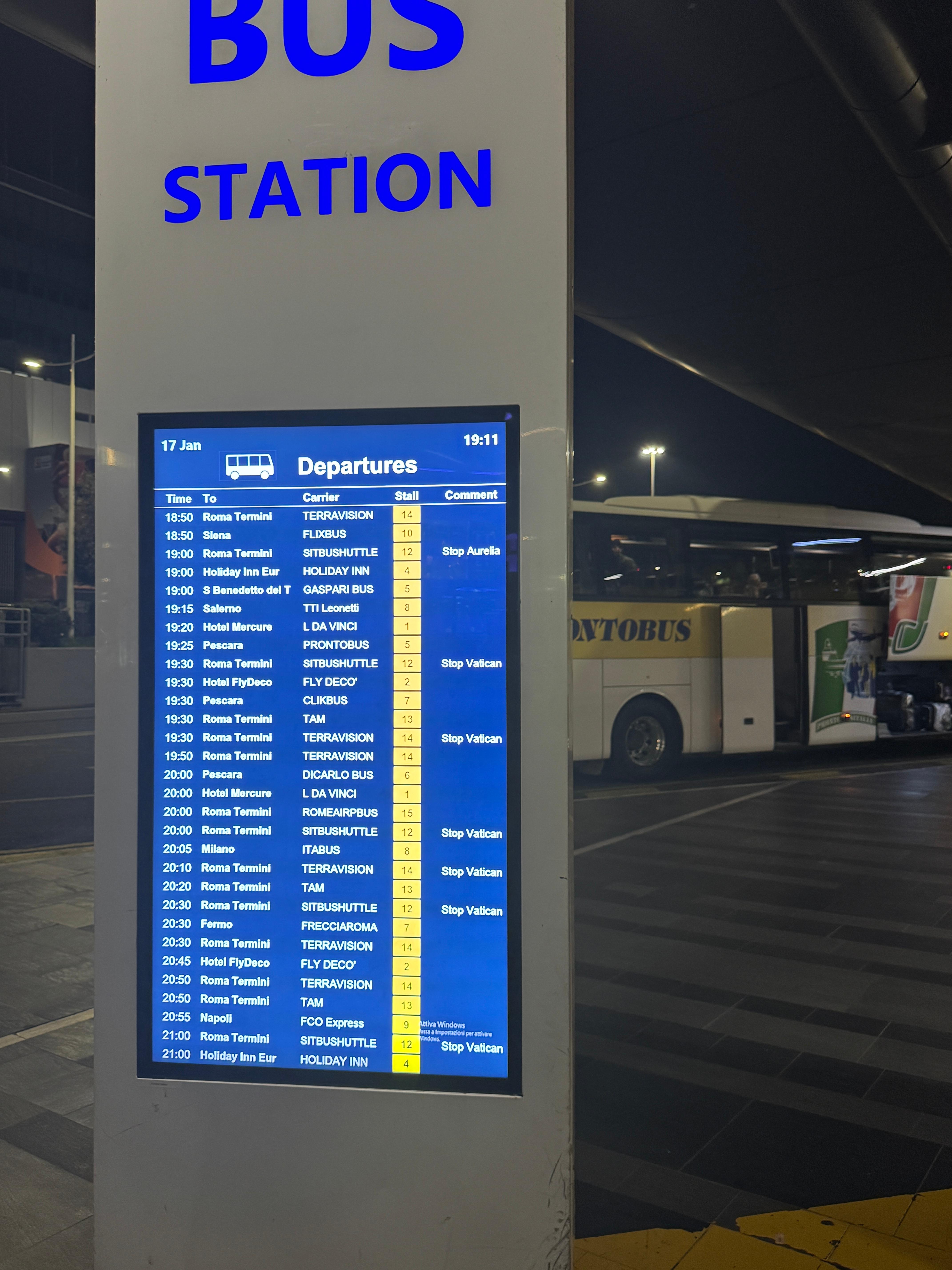 로마공항에서 시내로 가는 방법은 보통 기차 또는 버스인데, 버스가 1인당 6유로 정도로 저렴한 편이다. 공항을 나와 오른쪽으로 Bus 간판을 따라 이동하다 보니 아래와 같이 목적지와 버스회사에 따라 플랫폼을 안내하고 있다.