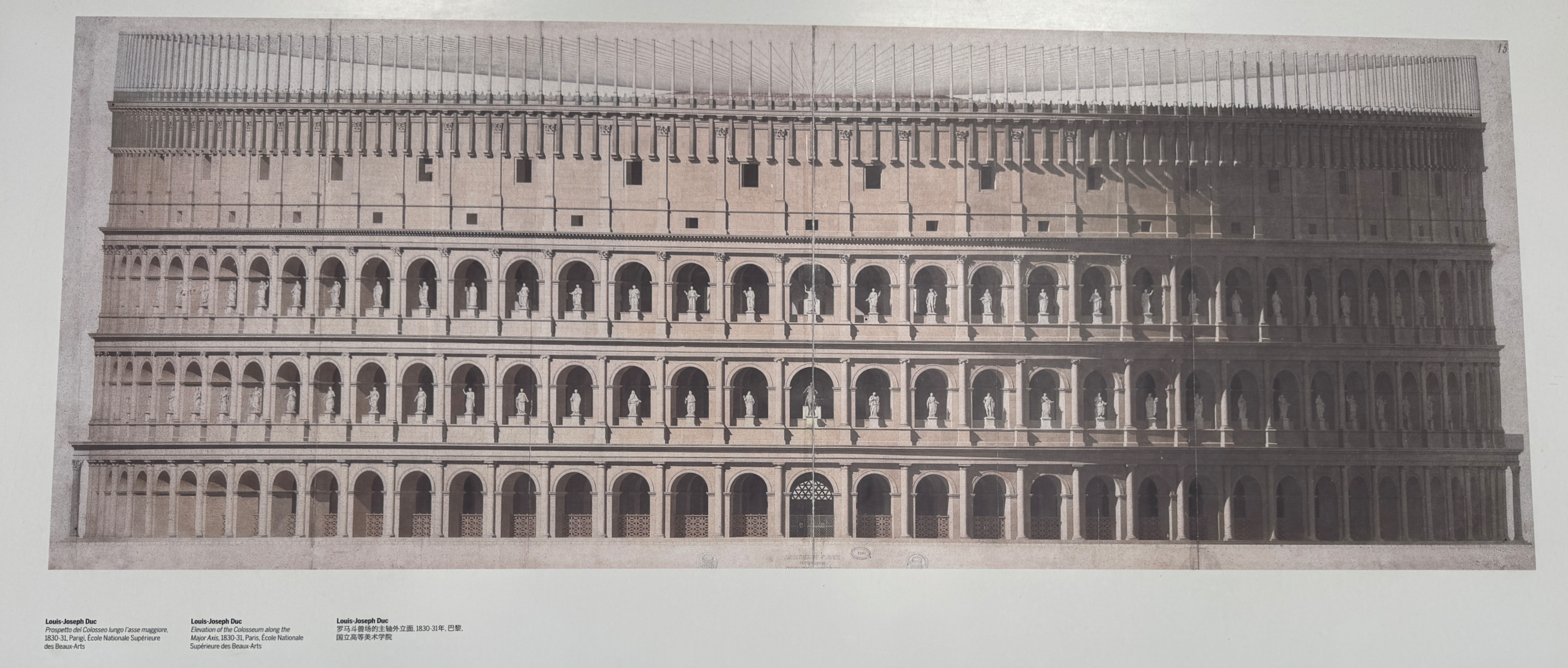 ARENA 지역 관람이 끝나고 올라가면 콜로세움 2층과 3층사이의 갤러리에 다양한 물품과 모형들이 전시되어 있다. 아래는 콜로세움의 정면을 그린 것 같은데 2층과 3층의 아치들에서 조각상들이 놓여있고, 천장은 망 같은 것으로 지붕이 덮여 있는 것을 알 수 있다.