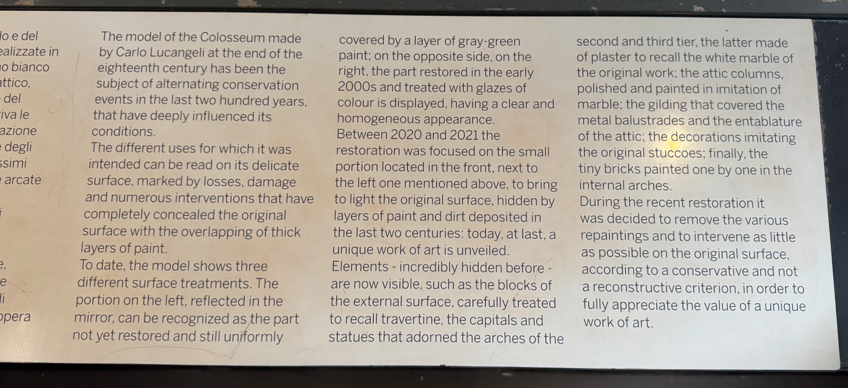위 모형에 대한 설명으로 18세기 말 Carlo Luncangeli가 만든 것으로 200년 동안 여러차례 보존/수리를 받으면서 상태가 많이 바뀌었다고 한다.