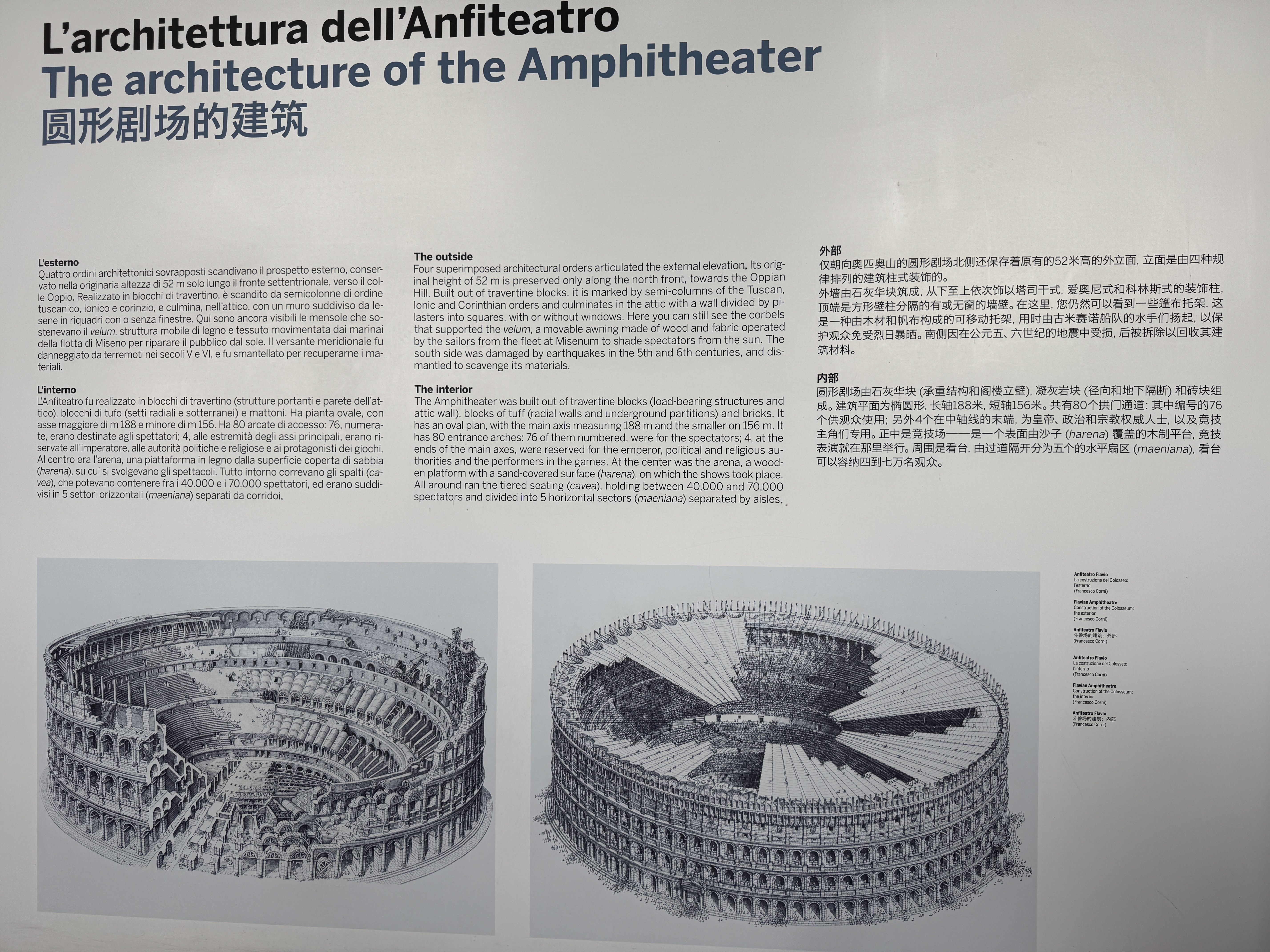 외부는 4겹으로 구성되어 있고 남쪽 경사면은 중세와 근대에 걸쳐 토석 채취장처럼 사용되어 사라진 것이라고 한다. 그림처럼 건물위는 차양막이 처져있었던 듯하다. 전체 수용인원은 4만~7만명으로 추정된다고 한다.