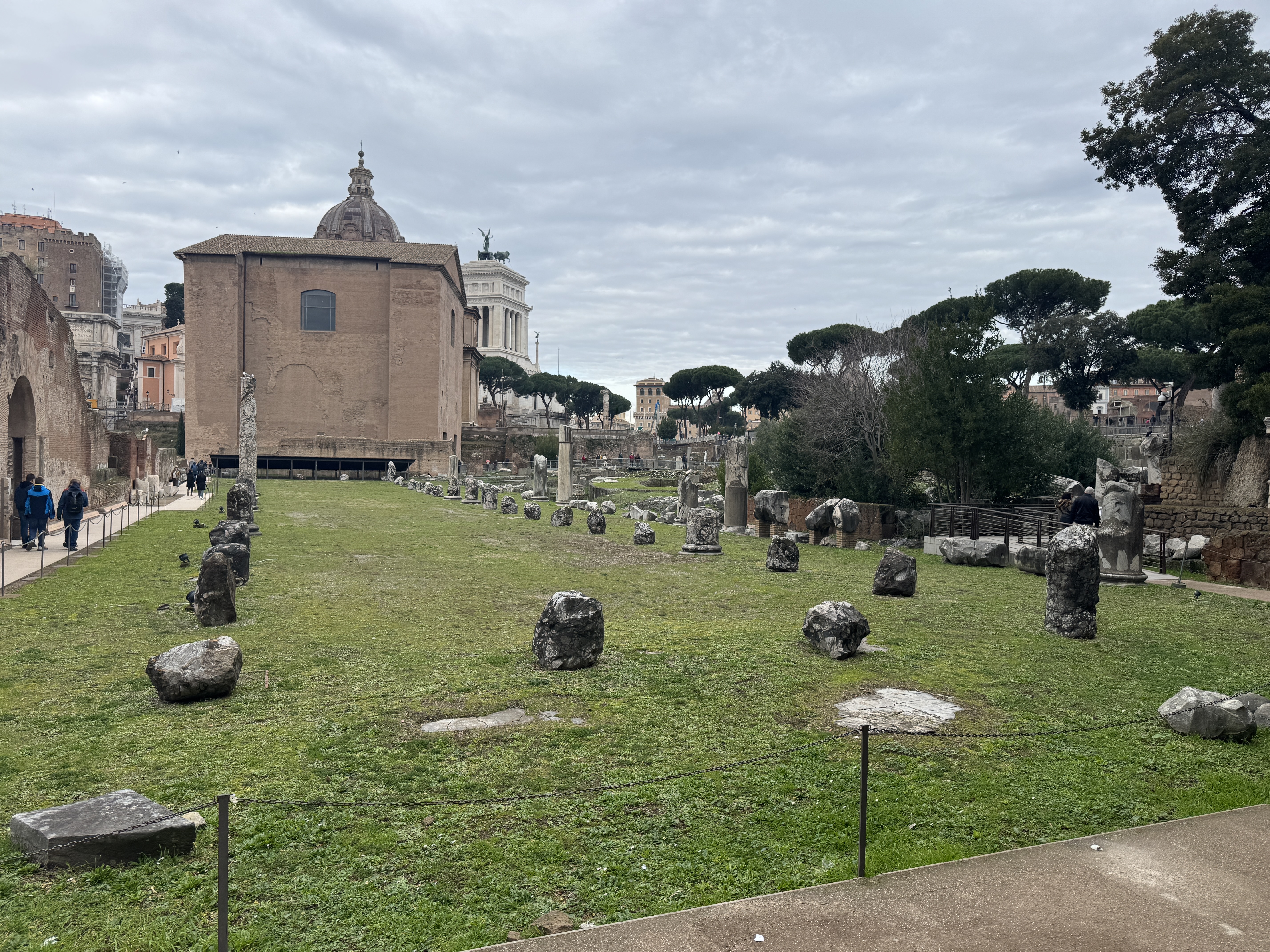 포로 로마노 북쪽 출입구 쪽으로 나오면서 찍은 Basilica Emilia 유적지이다. 잔디밭에 흔적만 남아있는 모습이다.