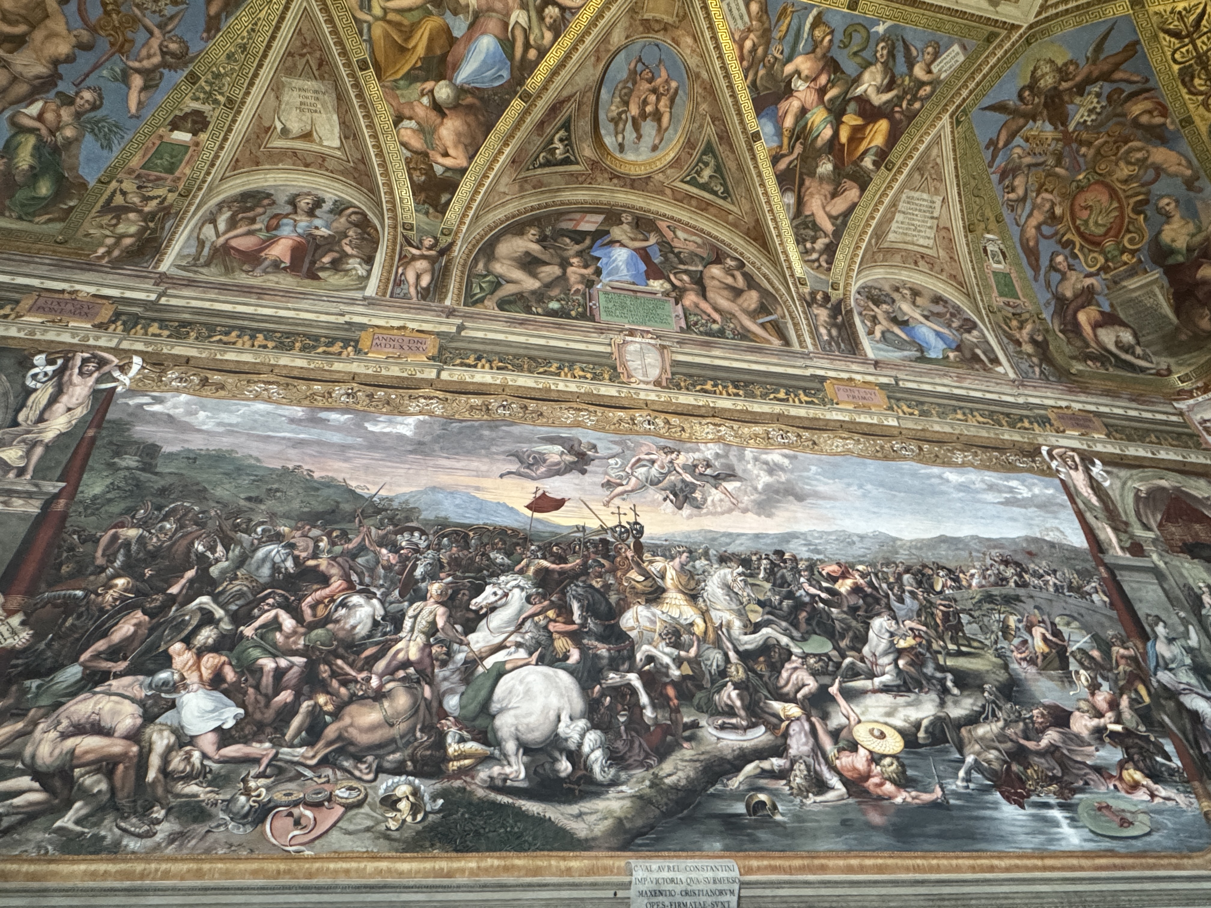 다음으로 라파엘로의 방이 나온다. 다음은 라파엘로의 방(Stanze di Raffaello) 중 콘스탄티누스의 방(Sala di Costantino)에 있는 벽화로, 라파엘로 공방이 그린 「콘스탄티누스의 마크센티우스에 대한 승리(밀비우스 다리 전투)」 장면이다. 이 전투 이후 콘스탄티누스 황제가 밀라노 칙령을 발표하여 기독교를 공인했다고 한다.
