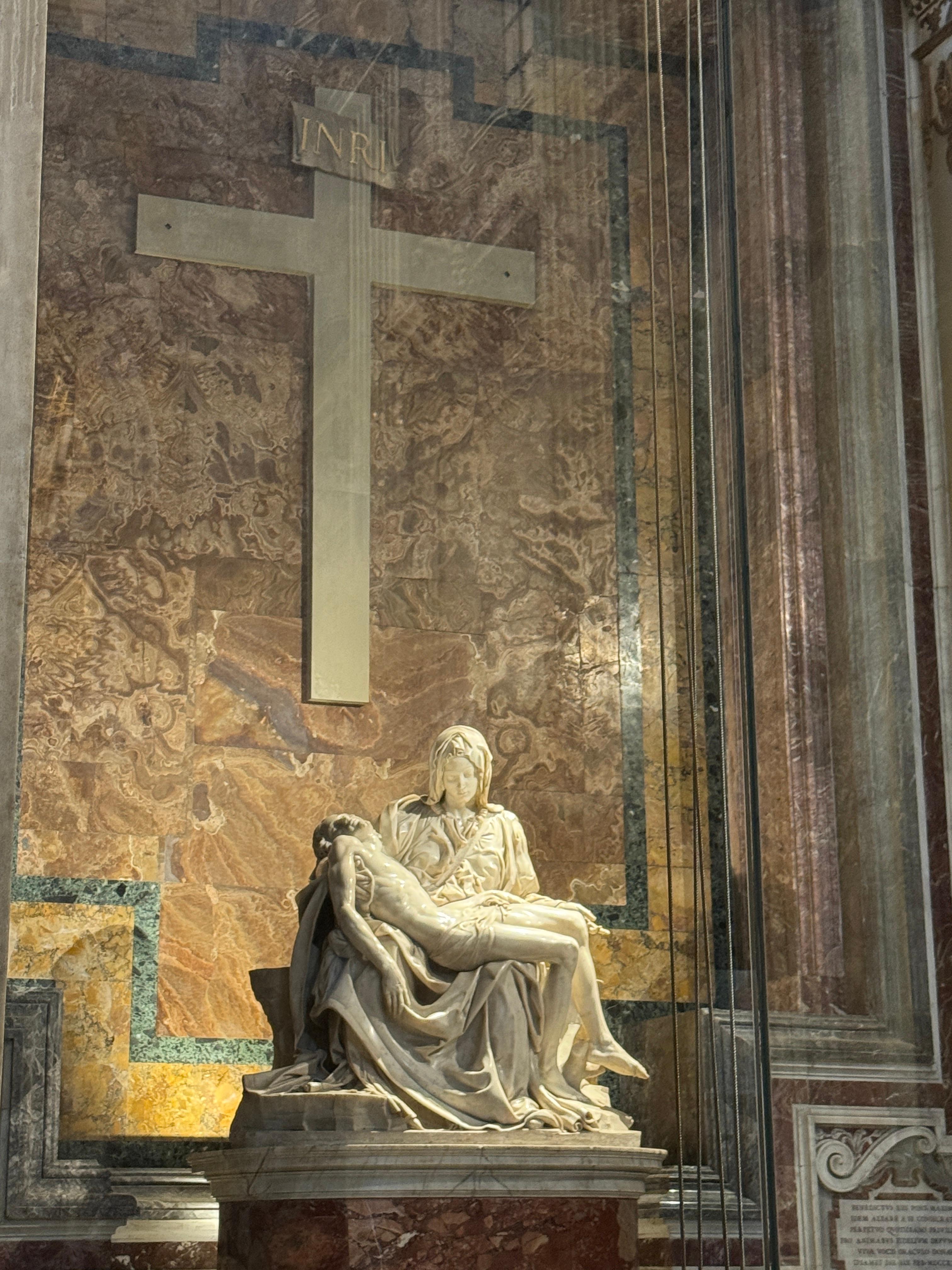 성 배드로 성당에 들어가는 이유 중 하나가 바로 아래의 작품 때문이다. 미켈란젤로의 피에타! 입구 바로 오른쪽에 유리로 보호되어 있다. 성모마리아의 옷 대각선으로 미켈란젤로의 서명이 들어가 있다고 한다. 저런 옷 주름하나 하나 묘사하다니 대단하다.