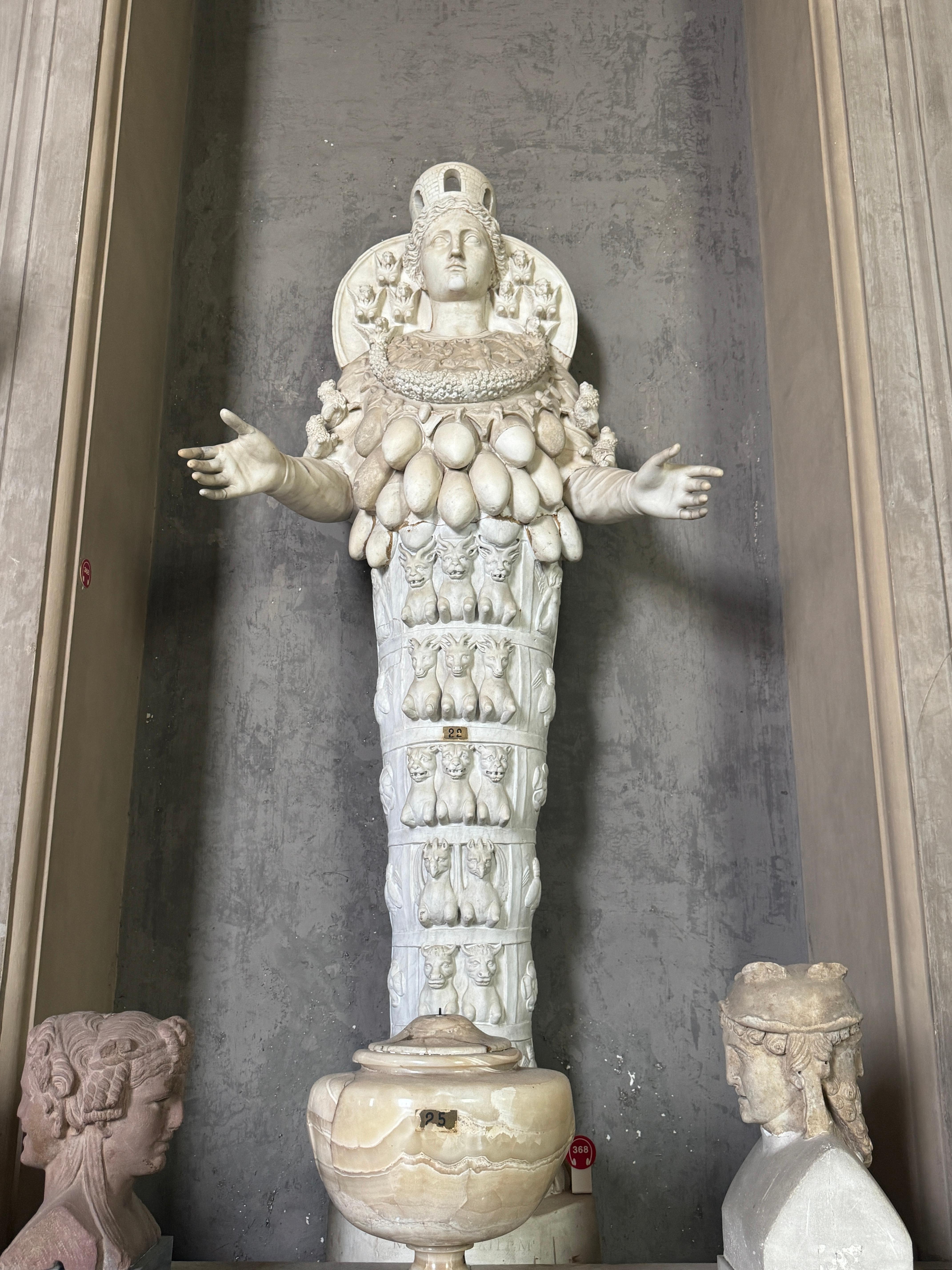 에페소스의 아르테미스(다산의 여신, Artemis of Ephesus) 상으로 상반신에 달려있는 것이 젖가슴, 황소 고환, 석류, 알 등으로 다양한 해석이 있다고 한다.