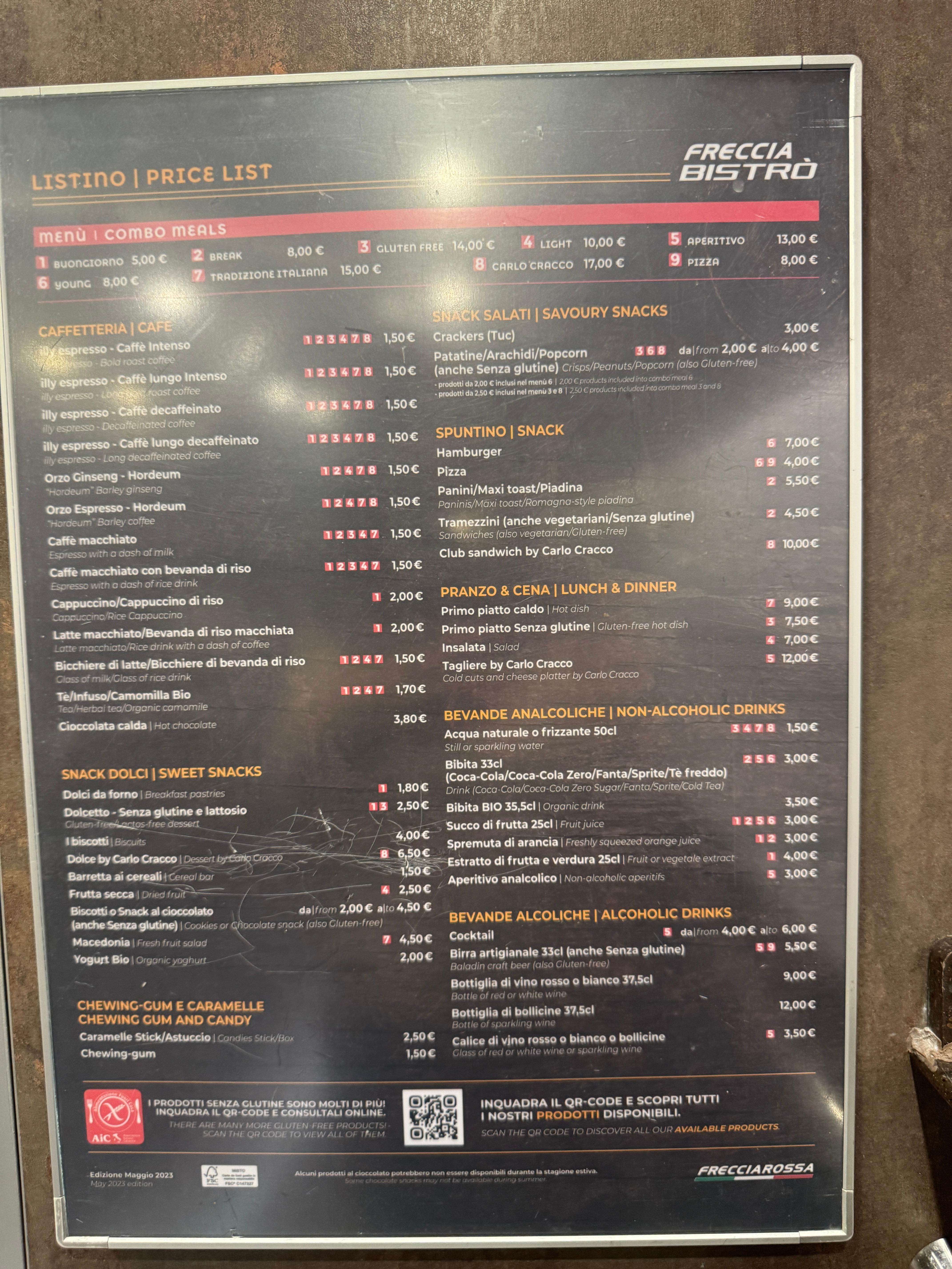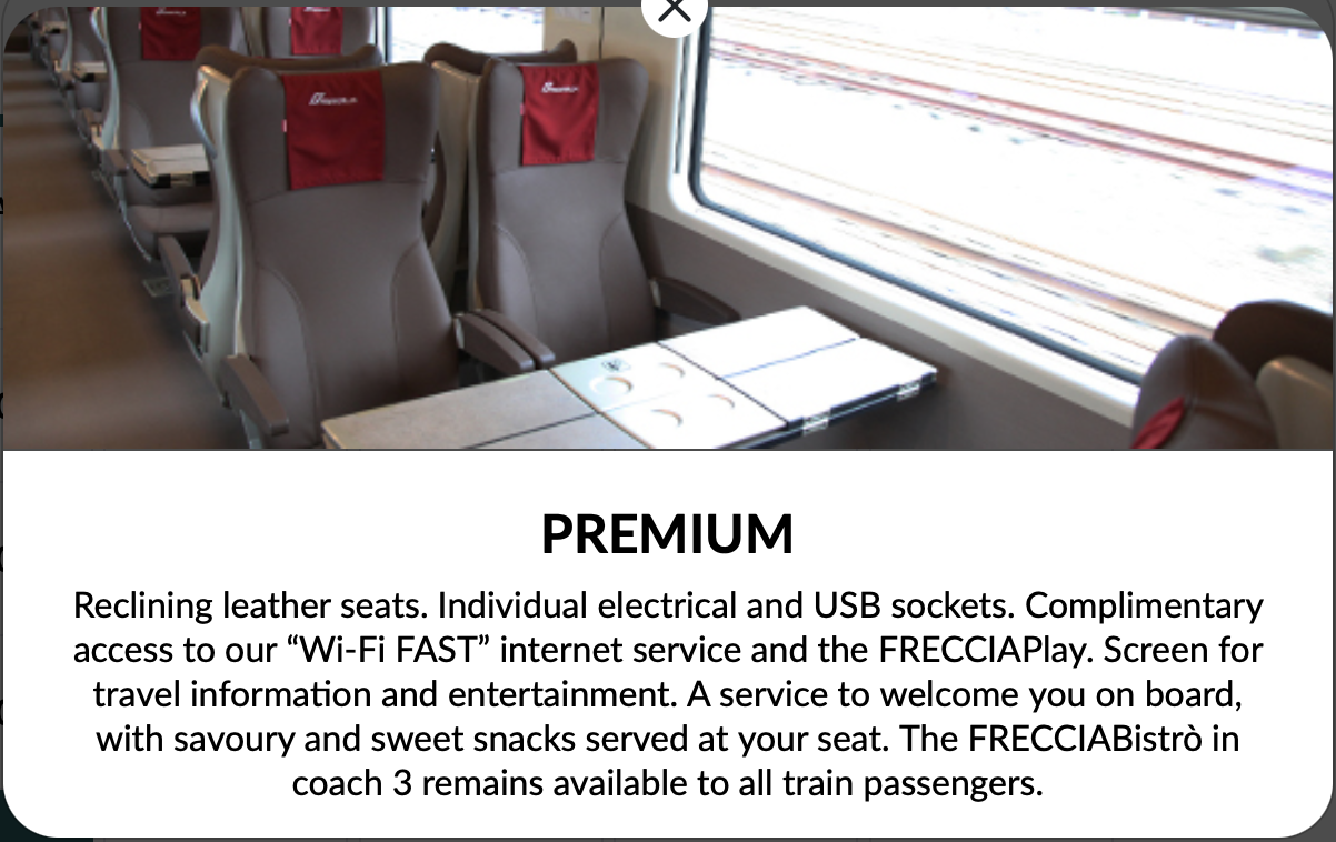 한편, 우리나라의 경우 일반석과 우등석이 있지만 트랜이탈리아는 Standard, Premium, Business (일반/대화금지), 1등석으로 조금더 세분화 되어 있다. Standard와 Premium은 음료와 스낵을 주냐의 차이 정도이고 비지니스와 1등석으로 갈수록 좌석 간격이나 공간이 더 넓어진다. 로마에서 베네치아까지 4시간 정도 걸려 프리미엄석으로 하고, 베네치아에서 밀라노는 2시간반 정도라 스탠다드 좌석으로 가족석으로 예약했다.