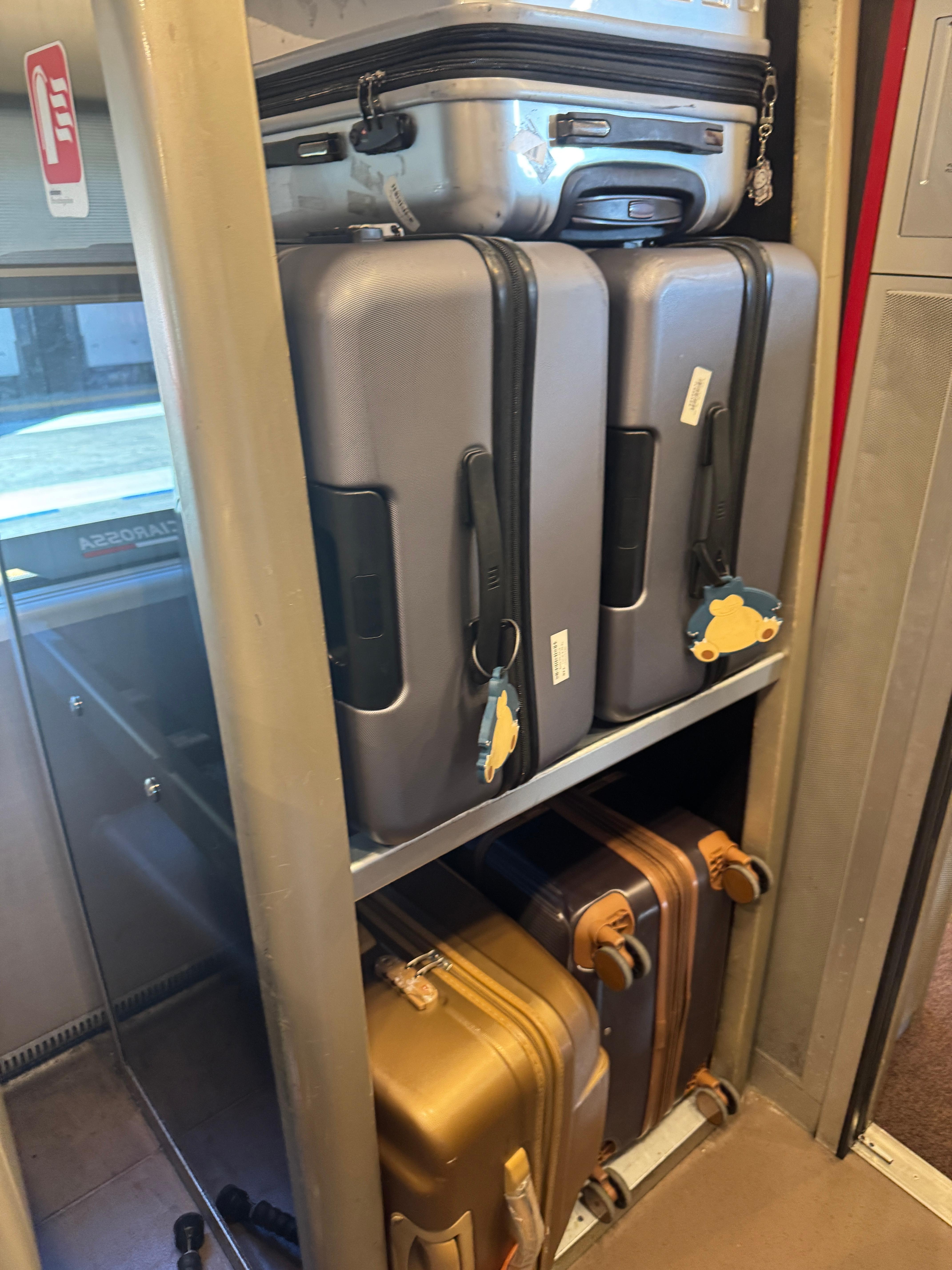 여행용 가방은 아래와 같은 객차 사이 공간과 좌석 위 공간에 넣을 수 있다. 우리는 28인치 여행용 가방 2개와 24인치 1개, 20인치 1개 총 4개를 가지고 다녔는데, 객차 사이 공간에 넣기위해 최대한 일찍 객차에 타도록 서둘렀다. 로마 테르미니역에서 출발하는 기차라 조금만 서두르면 쉽게 넣을 수 있었다. 기차에서 여행용 가방 도난 당했다는 말도 많아서 굳이 귀찮게 이렇게 여행용 가방을 올려놓고 금속끈으로 자물쇠까지 채웠다.