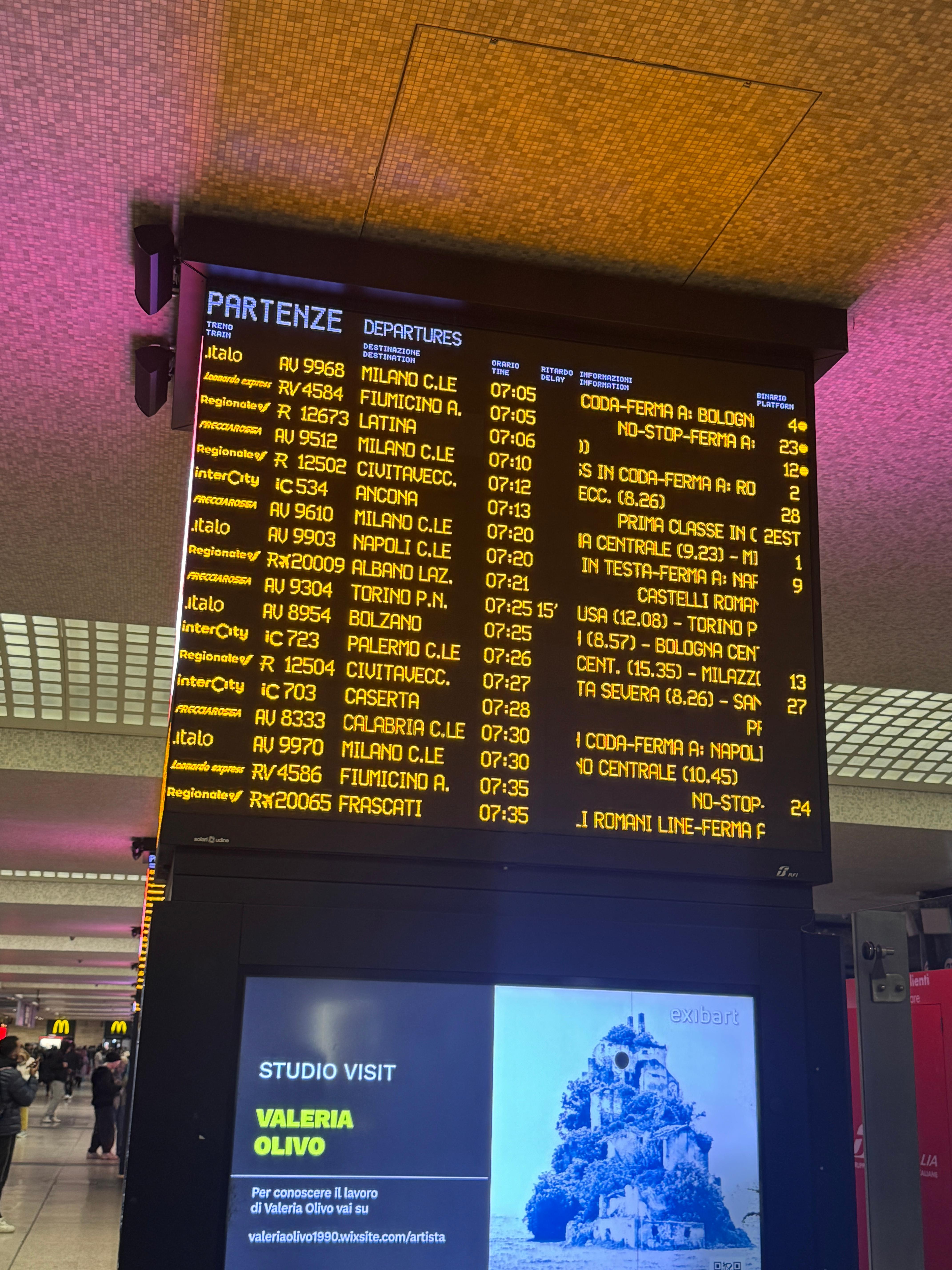 로마 테르미니 역 앞의 숙소에서 묵었기 때문에 아침 일찍 대충 식사를 하고 숙소를 나왔다. 기차역에서 출발편 기차 리스트의 전광판으로 부터 기차번호와 출발시간으로 플랫폼을 확인해야 한다.