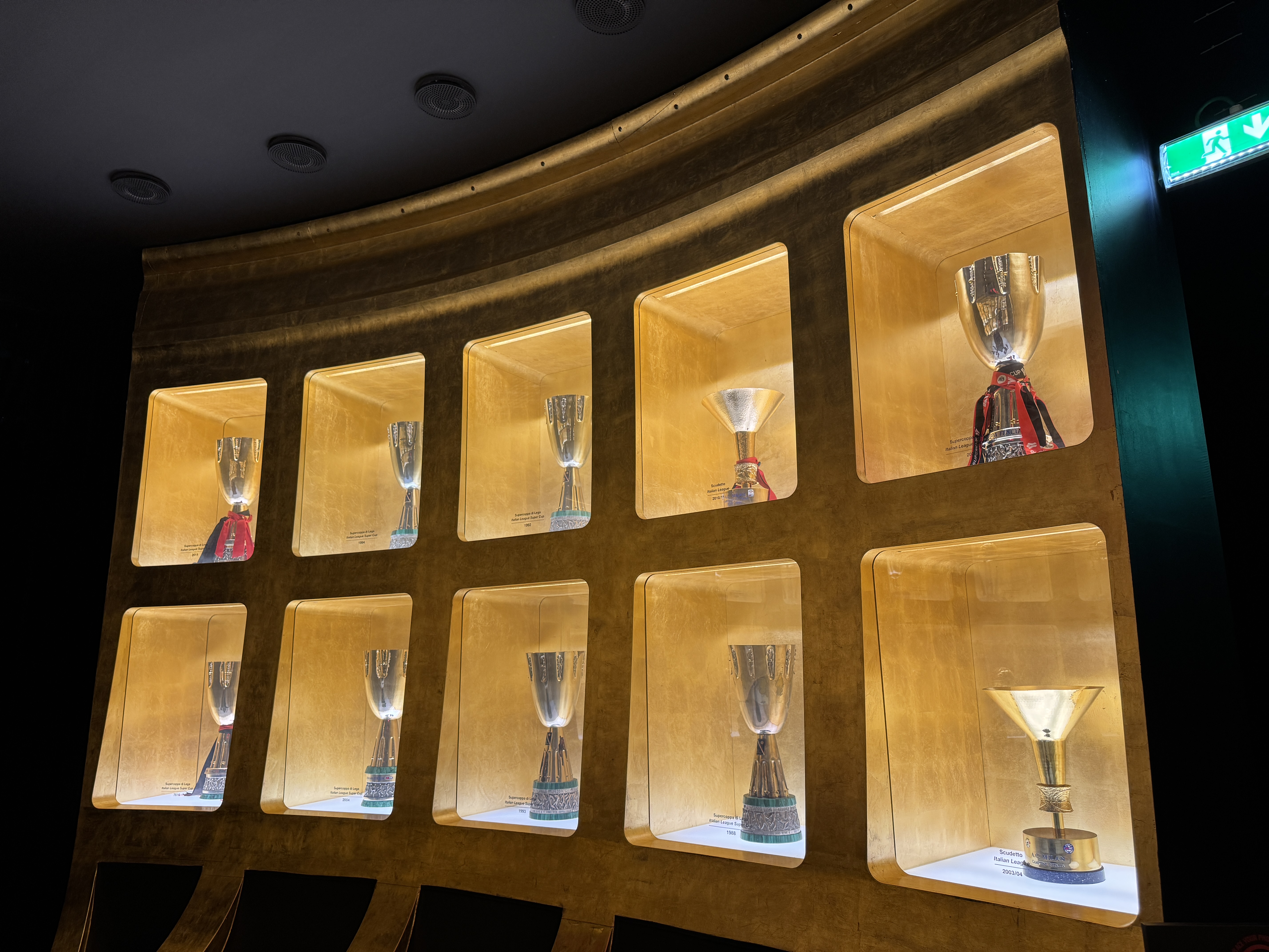 이탈리아 리그와 리그컵 대회 우승트로피들이 반대편에 전시되어 있다.