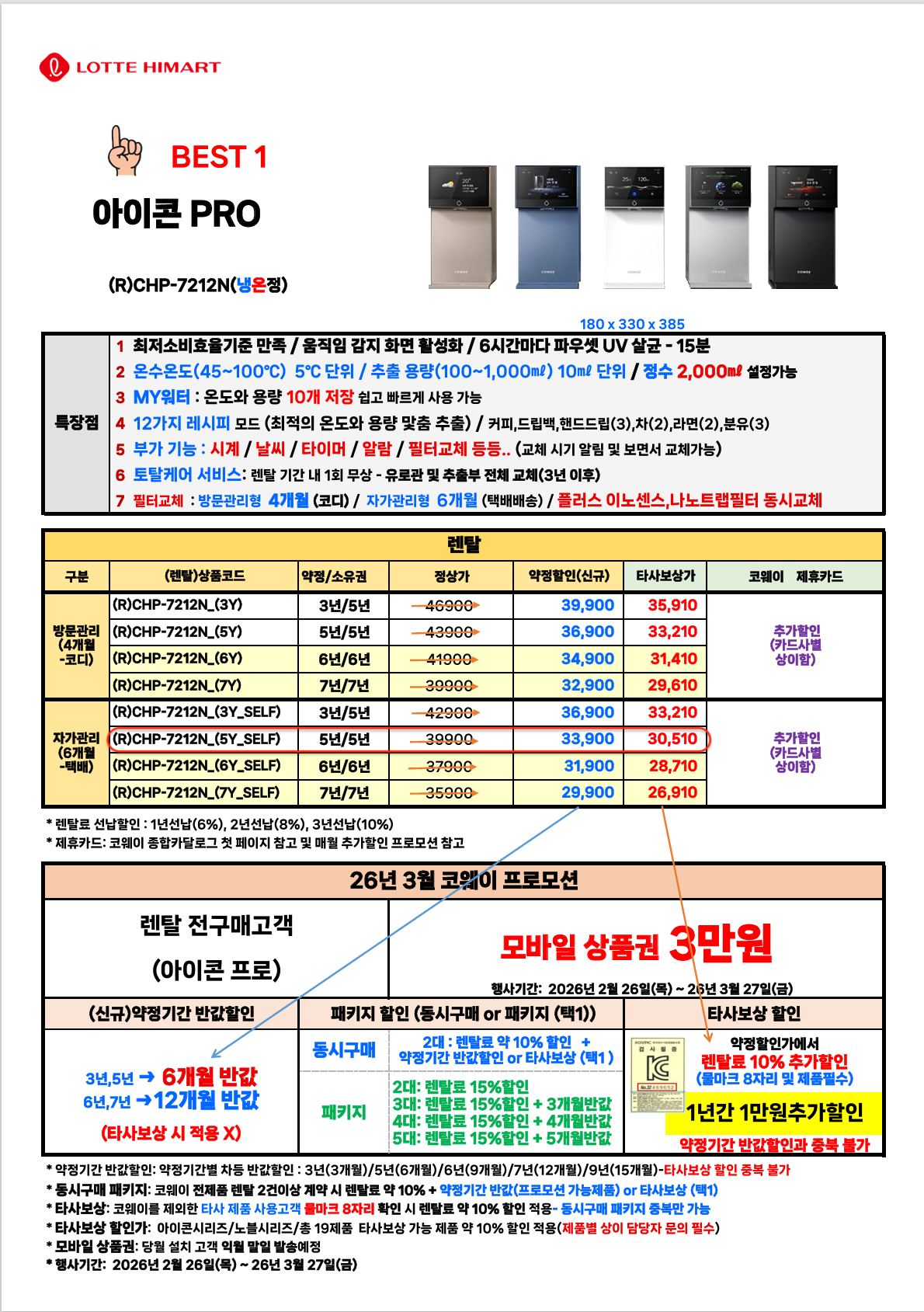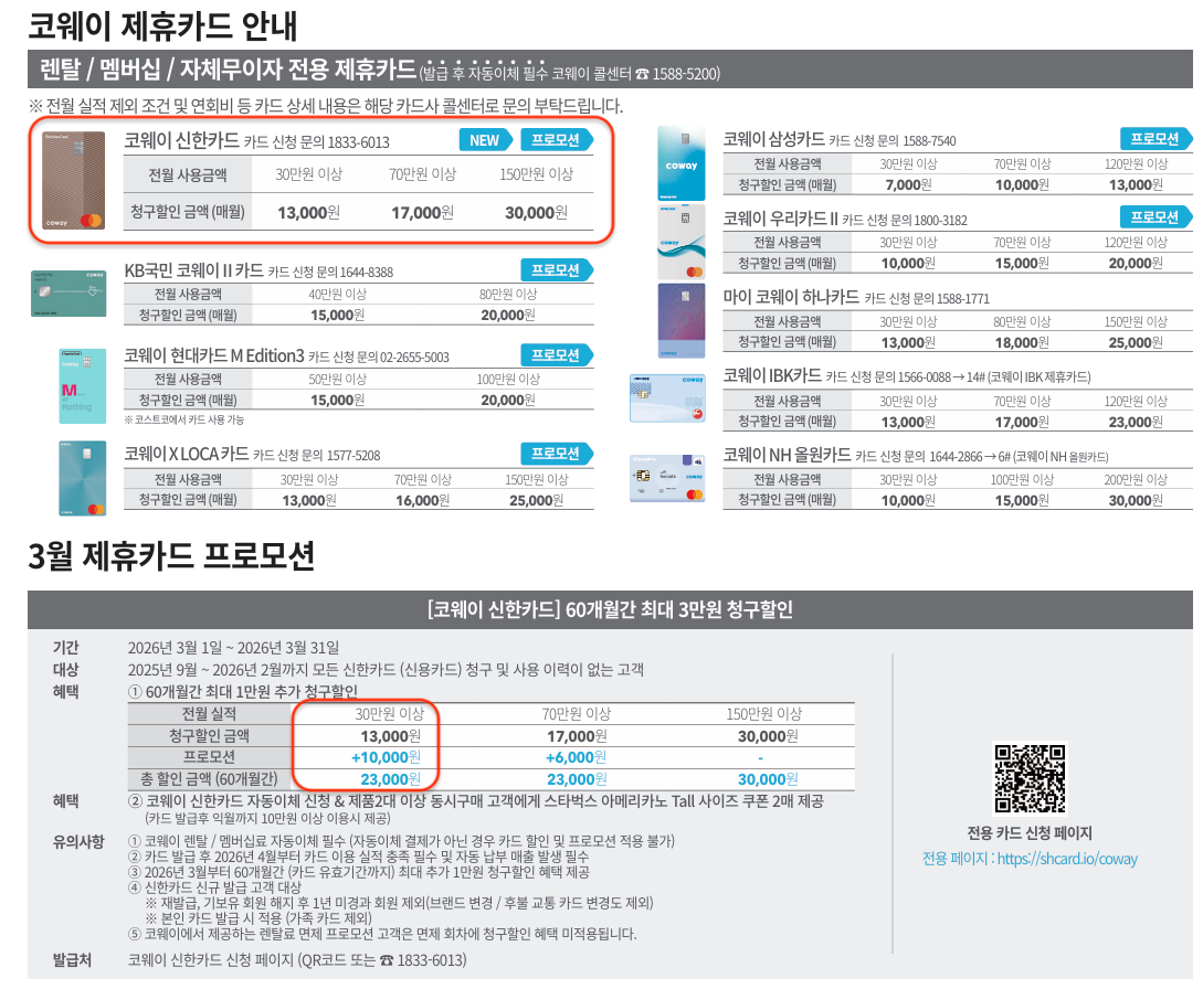 - 월 30,510원 - 월 10,000원 (1년간, 타사보상) - 월 23,000원 (제휴카드 30만원이상) = 0원 (1년간) / 7,510원 (남은 4년간)